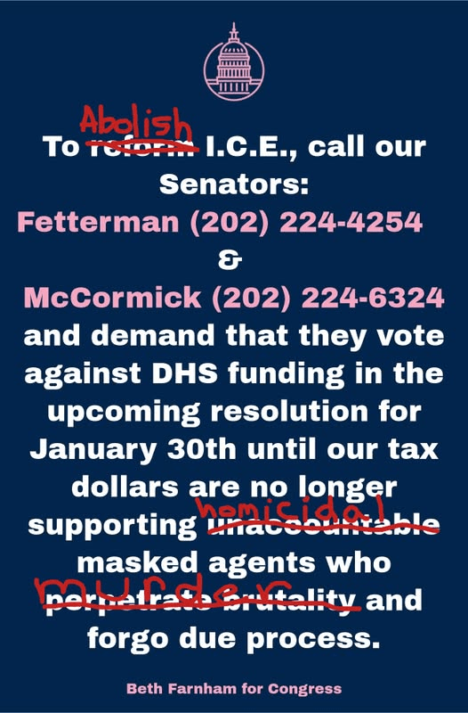So please call Senators Fetterman and McCormick and demand they vote against DHS funding until ICE is abolished.